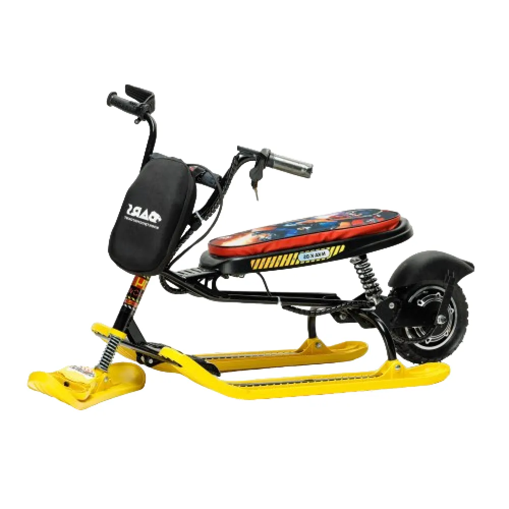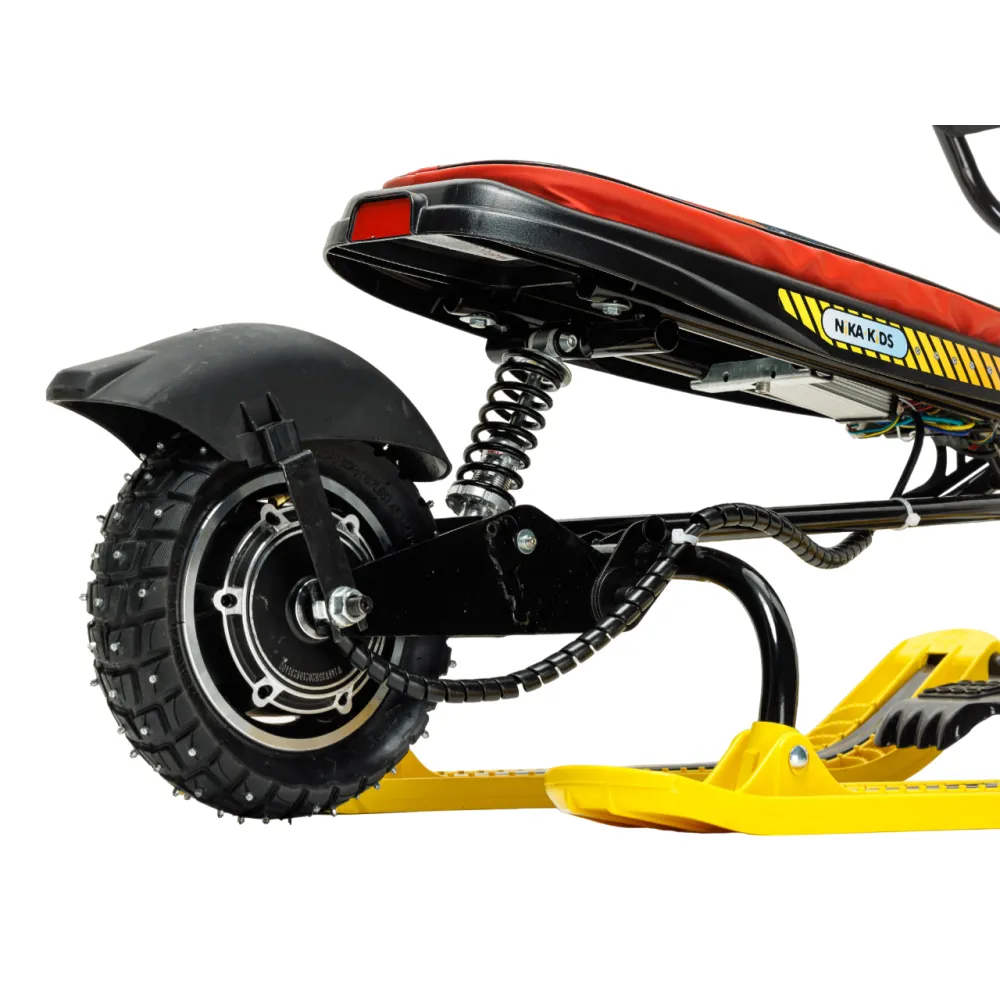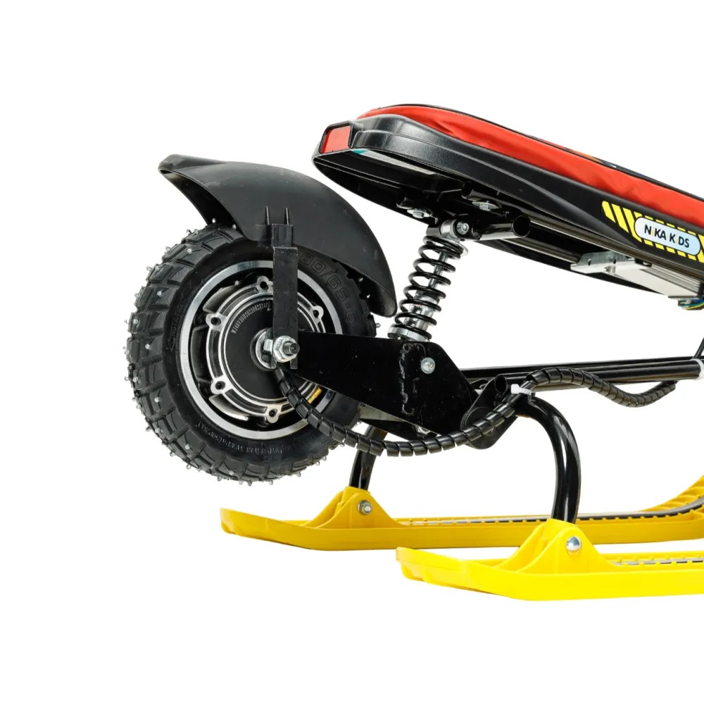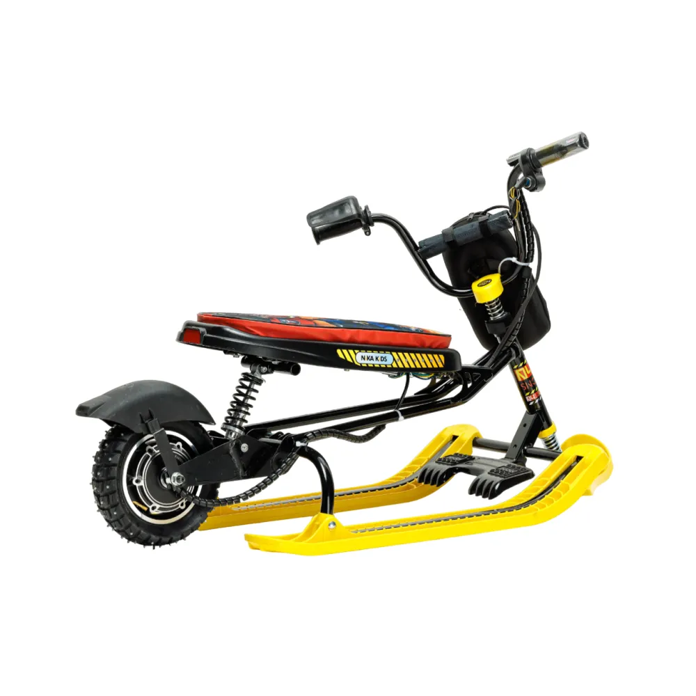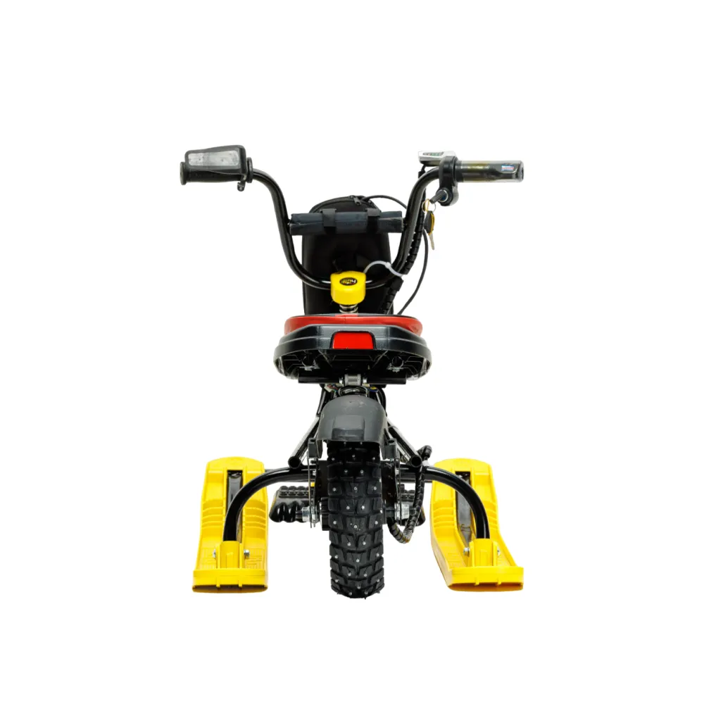Снегокат оснащен мощным электродвижком на 400Вт. Максимальные параметры нагрузки составляют 108 кг, максимальный скоростной режим – 20 км/час. При этом вес техники сравнительно легкий, составляет 14 кг. 10 дюймовое накатистое колесо в сочетании с брендовыми амортизаторами и широкими лыжами обеспечивают отличный разгон за минимальный промежуток времени.