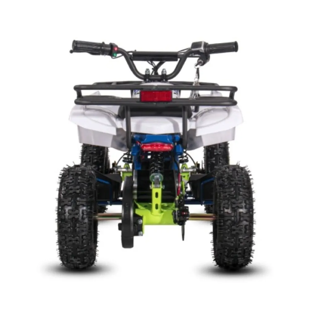 Колеса 4,1-6 (задние 10*5,00-6) вращаются свободно и имеют протекторную поверхность. Сидение правильной формы и руль гарантируют высокий комфорт езды и отсутствие ощущения усталости. Надеемся вам понравился электроквадроцикл. Для заказа свяжитесь с нашим менеджером.