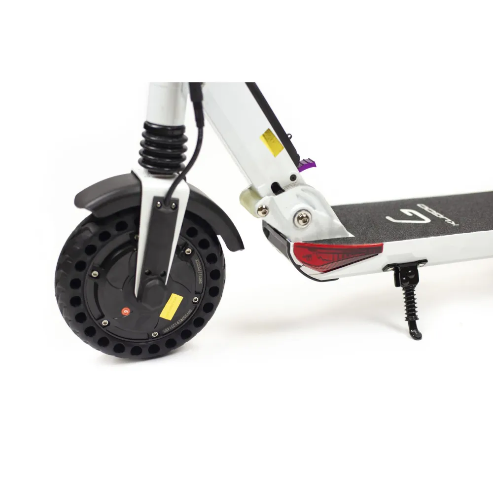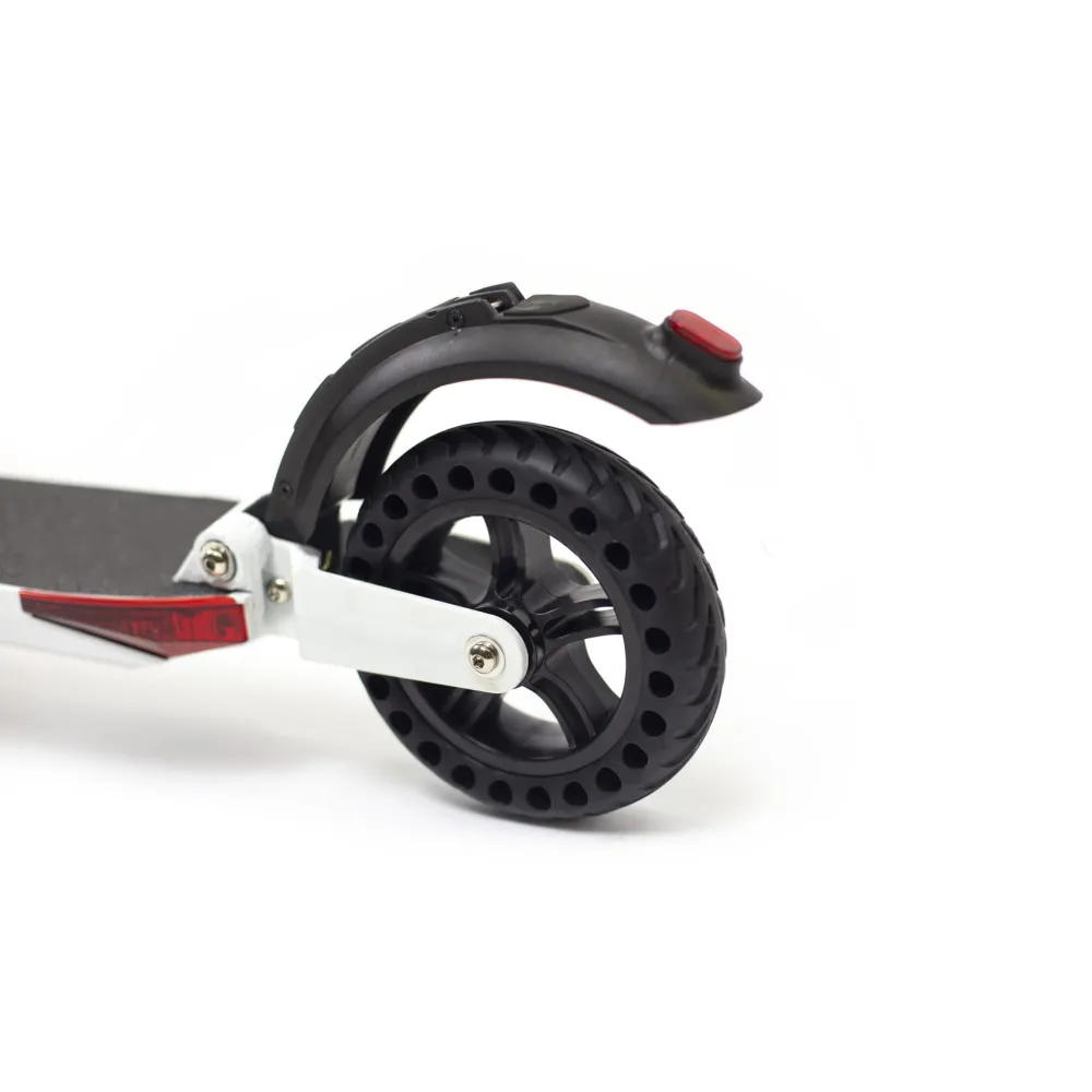 Поперечные отверстия на шинах, которые делают катание мягким и плавным. Движение по любым покрытиям ровным и неровным доставит во время катания не только удовольствие, но и надежную сцепку с дорожным покрытием. Благодаря колесам в 8 дюймов электросамокат обратит на себя внимание окружающих. Модель оснащена современной фарой спереди и двумя габаритами по бокам.