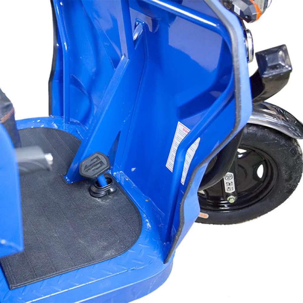 Этот электротрицикл оснащен гидравлическим приводом, что обеспечивает плавное и стабильное управление. Передняя подвеска состоит из усиленных гидравлических амортизаторов, которые обеспечивают комфортную езду даже на неровных поверхностях.