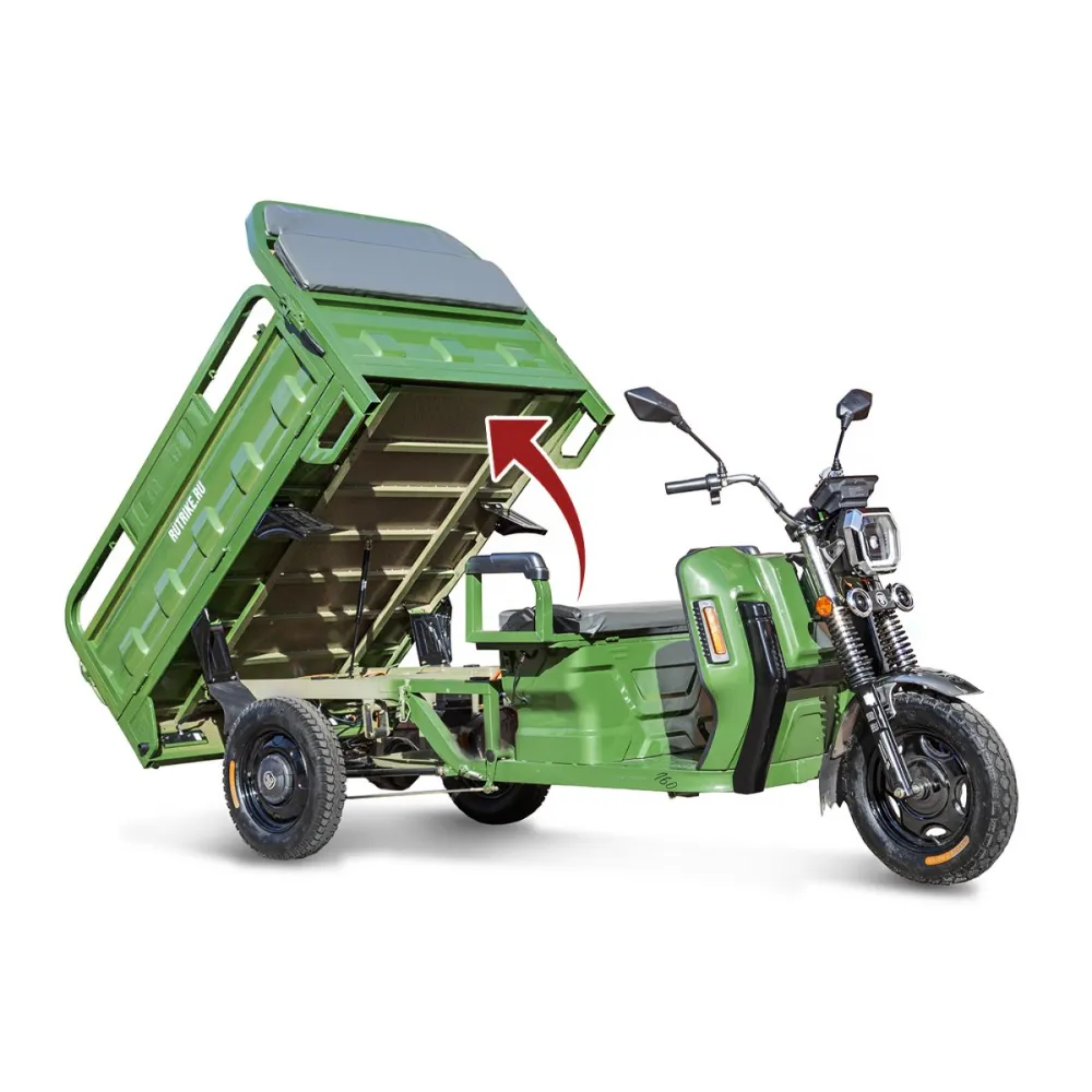 Грузовой электротрицикл Rutrike Маяк 1600 60V1000W зеленого цвета - это надежное и эффективное транспортное средство для перевозки грузов. Его мощность, грузоподъемность и барабанные тормоза делают его отличным решением для различных бизнес-потребностей.