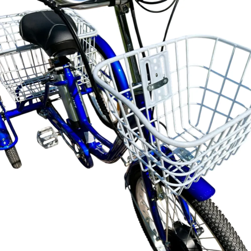 Велосипед, АКБ, ЗУ (110–240В 2A), корзины, звонок. Опции: зеркала, замок. Совместим с универсальными (крылья, багажники).