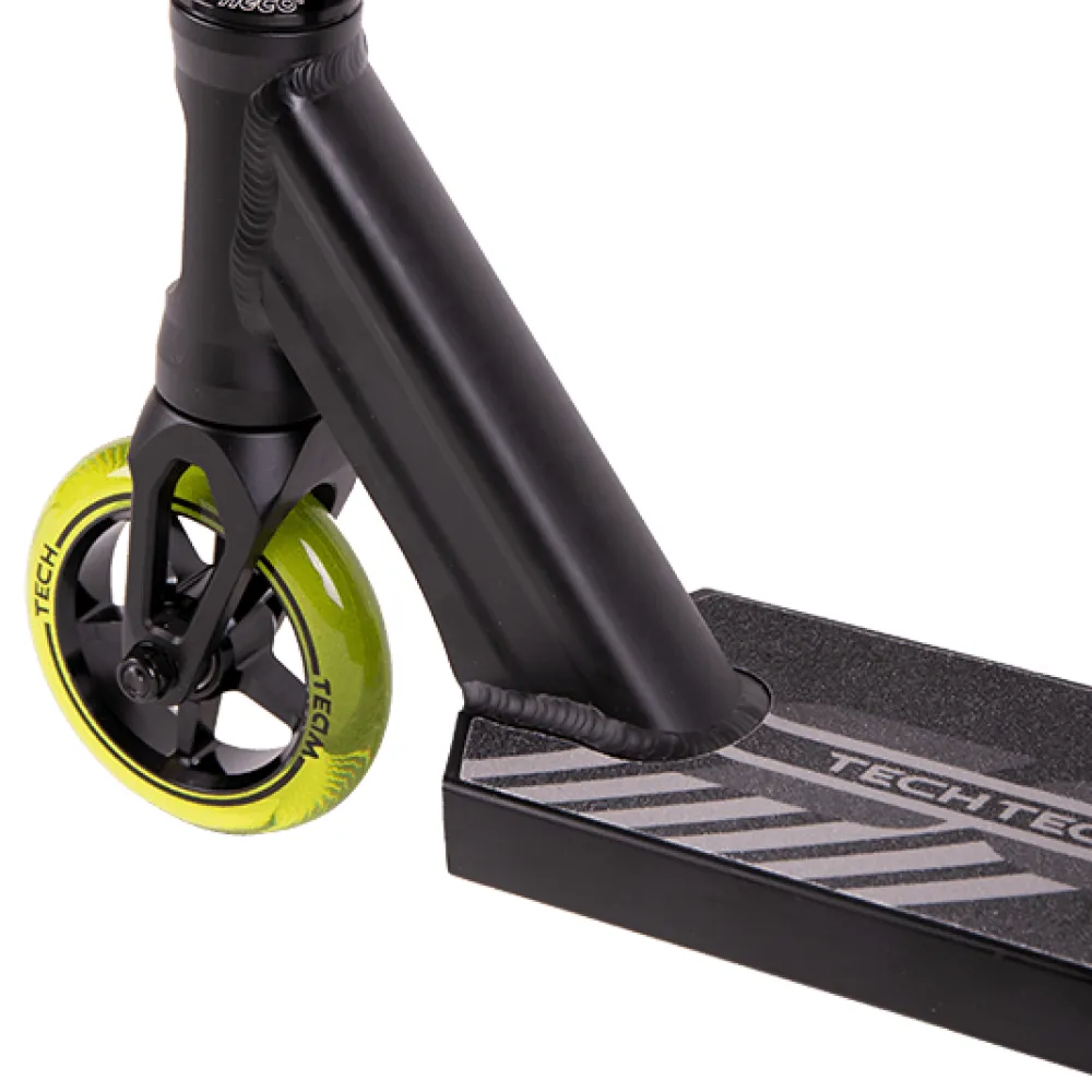 На этапе изготовления компания tech учла ошибки предыдущей линейки. Самокаты tech для начинающих райдеров изготовлены из высокопрочного надежного материала. Парковый самокат имеет алюминиевую деку габаритами 49х12 см с футспейсом 34 см. Оснащенность team scout конкейвом позволяет осваивать трюковые элементы, контролировать действия ездока. Трюковый самокат tech team имеет Т-образную форму руля. Ширина руля составляет 54см. Высоты руля от зажима (61,5 см) достаточно для ездоков начального уровня. Базовая модель techteam scout оснащена накатистыми полиуретановыми колесами с металлическим сердечником, промышленными подшипниками Abec 9. Каждый из трюковых элементов гарантирует максимальный разгон, важный для каждого трюкача.