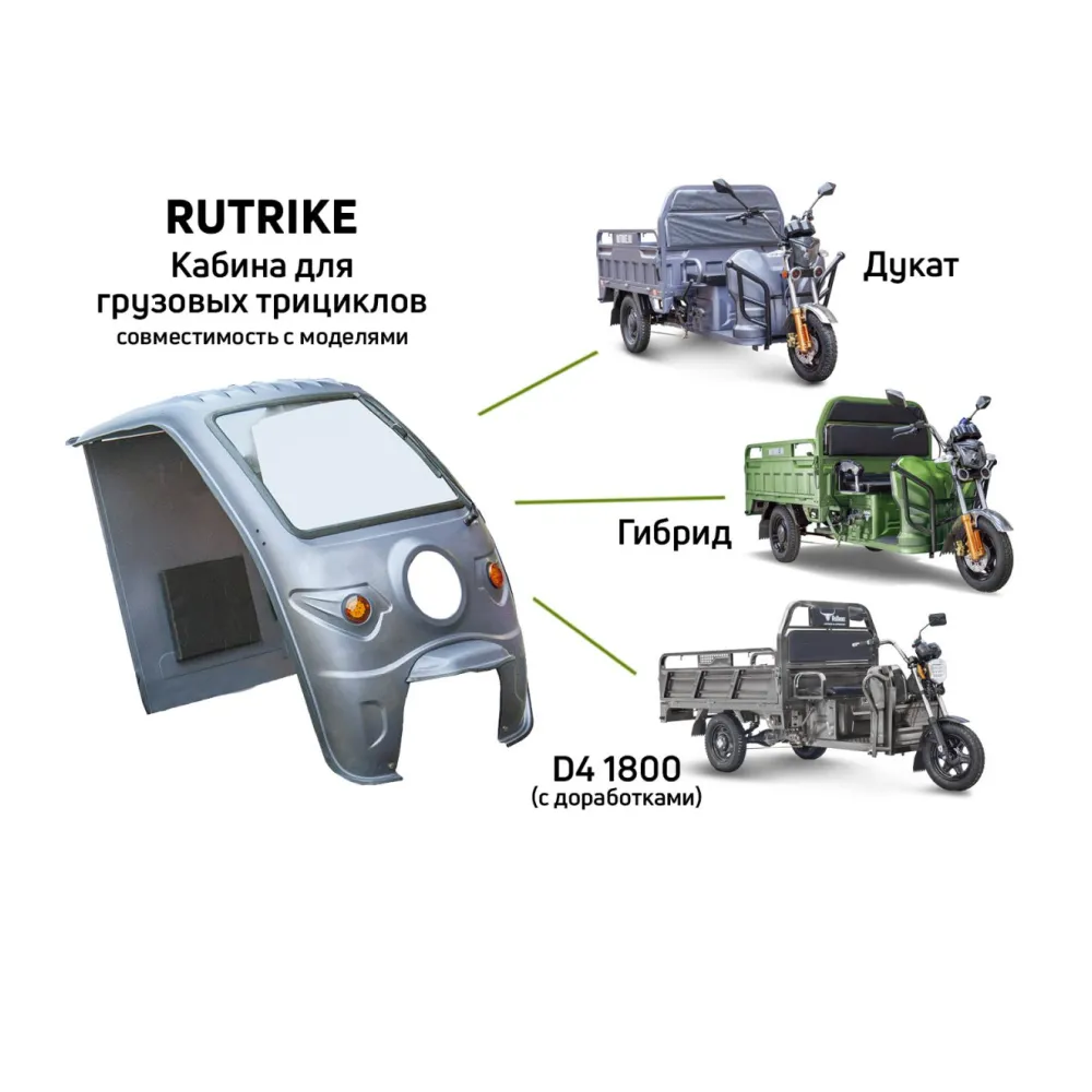 Металлическая кабина для грузовых электрических трициклов Rutrike – это идеальное решение для тех, кто ценит комфорт и безопасность на дороге. Эта кабина спроектирована с учетом потребностей современных водителей и обеспечивает надежную защиту от неблагоприятных погодных условий, что особенно актуально для городских условий эксплуатации.Кабина совместима с различными моделями, такими как Дукат, D4 1800, Карго, Глобус и другими, что делает ее универсальным выбором для владельцев электрических трициклов. В комплектацию кабины входит все необходимое для комфортного вождения: яркие световые приборы, включая фары и поворотники, обеспечивающие отличную видимость как днем, так и ночью. Задняя мягкая спинка для водителя добавляет удобства во время длительных поездок, позволяя расслабиться и сосредоточиться на дороге.Кроме того, зеркала заднего вида обеспечивают хороший обзор, что крайне важно для безопасности. Стеклоочиститель с установленным моторчиком и кнопкой включения позволит поддерживать чистоту стекол, даже в условиях дождя или сильного загрязнения.Мы – официальный дилер бренда RuTrike и гарантируем высокое качество продукции и профессиональное обслуживание. Выбирая металлическую кабину для вашего трицикла, вы делаете шаг к улучшению своих транспортных возможностей и повышению уровня безопасности в пути. Не упустите возможность сделать ваши поездки более комфортными и защищенными с помощью нашей кабины!